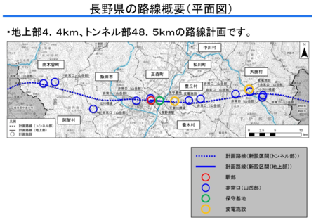 〇長野県内の総延長は、52.9kmでトンネル部(48.5km)が全体の91%を占めます。