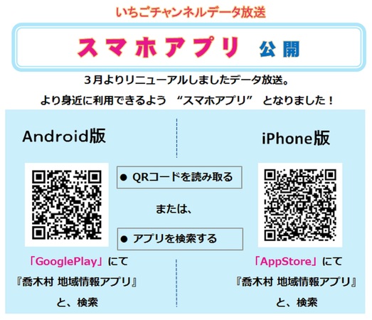 ・告知内容は、村・自治会・団体からのお知らせ、JA・企業からのお知らせ、学校からのお知らせなど、暮らしに必要な情報をお届けします。
