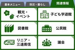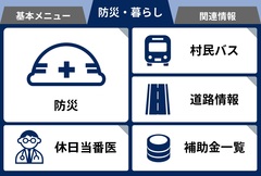 観光、村外者向け観光情報、イベント、ごみの収集日、防犯、通行止め、健康、動物・ペット、採用情報、募集、お悔み、農業、図書館、村からのお知らせ(情報誌など)