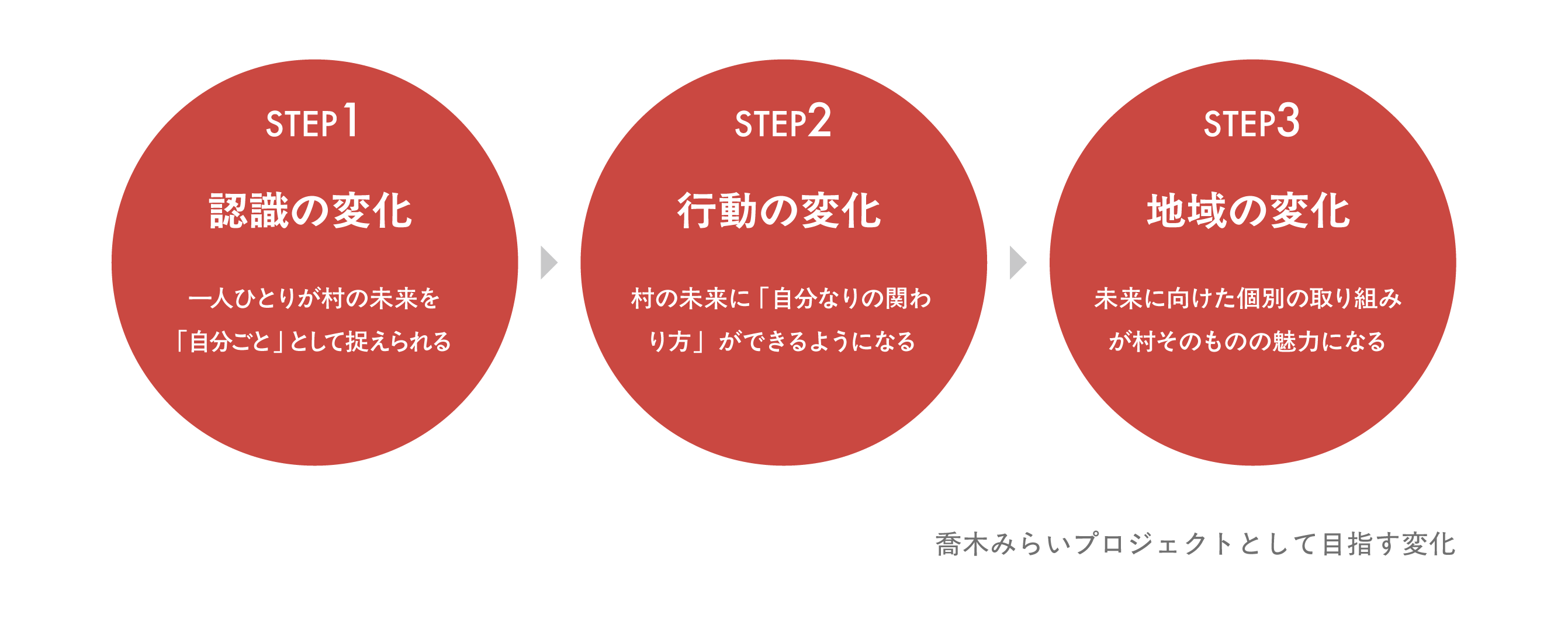 喬木みらいプロジェクトは、人口減少の現実や不確実性の高い現代社会、そして待ち受ける困難な未来に対して、住民主体の活動を通した「共通認識(=ブランド)」が未来の鍵を握るとして立ち上がりました。