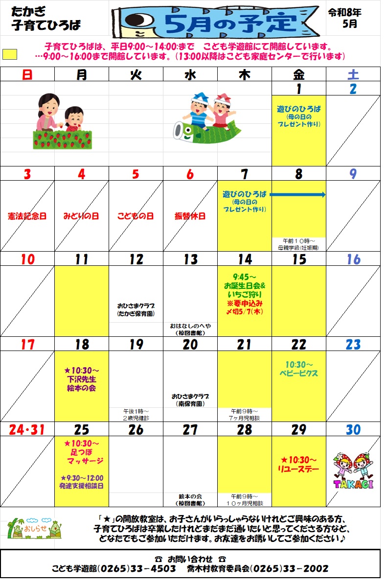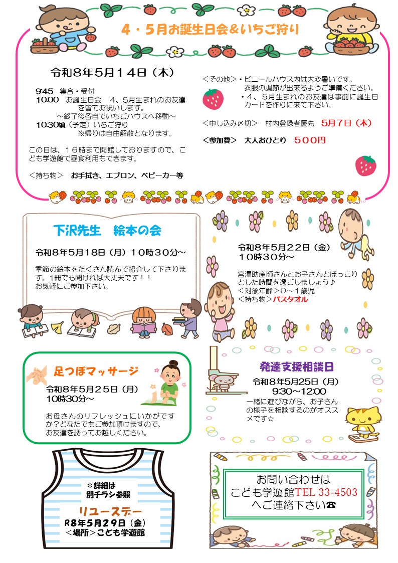 公開日 2026年04月27日 <利用についてのお願い> ○イベントの内容により通常利用ができない場合や開館時間が変更される場合があります。詳しくは、学遊館(☎33-4503)までお問合せ下さい。 <午前9時~午後4時開館について> 〇こども家庭センターを利用し、午後4時まで開館し遊べる日があります。予定表を確認のうえ、ご利用ください。 詳細はこちら↓↓↓
